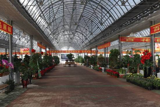 整个市场共分为五大区域。第一大区域是由拱形钢架构建而成的花卉展销大厅,建筑面积为21000平方米,展厅共有展位80余个,销售绿化苗木以及鲜花品种近3000种。大厅的顶部是内外双层设计,外层设有电动遮阴网,内层设有电动保温膜;厅内的控温系统主要是以地源热泵技术为主。厅内所有的钢柱均为中空设计,内设排水管道;第一大区域主要功能是商户用来进行花卉的批发和零售。在展厅的南北两侧建有4300平米的平房展厅,主要是经营花土、花肥、花药以及花卉的附属品。