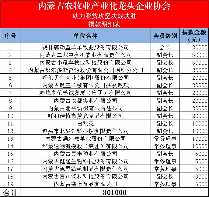 内蒙古农牧业产业化龙头企业协会,作为自治区各级产业化重点龙头企业的联合体,始终坚持以习近平总书记“三农”思想为根本遵循,围绕协会“沟通、服务、自律、发展”的工作宗旨,发挥协会的桥梁和纽带作用,坚持为企业服务、为行业服务、为政府服务、为农牧民服务。协会在自治区农牧厅的指导下,将继续坚持投身助力内蒙古脱贫攻坚工作中,贡献自己的力量。