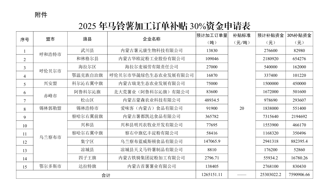 按照《内蒙古自治区农牧厅关于印发2025年马铃薯加工订单补贴项目实施方案的通知》(内农牧加工发〔2025〕305号)要求,经盟市组织申报、实地核查、公示,自治区复核,现将2025年相关盟市上报的马铃薯加工订单补贴30%资金申请情况予以公示,公示期为15天。如对公示有异议,请及时向自治区农牧厅反映。