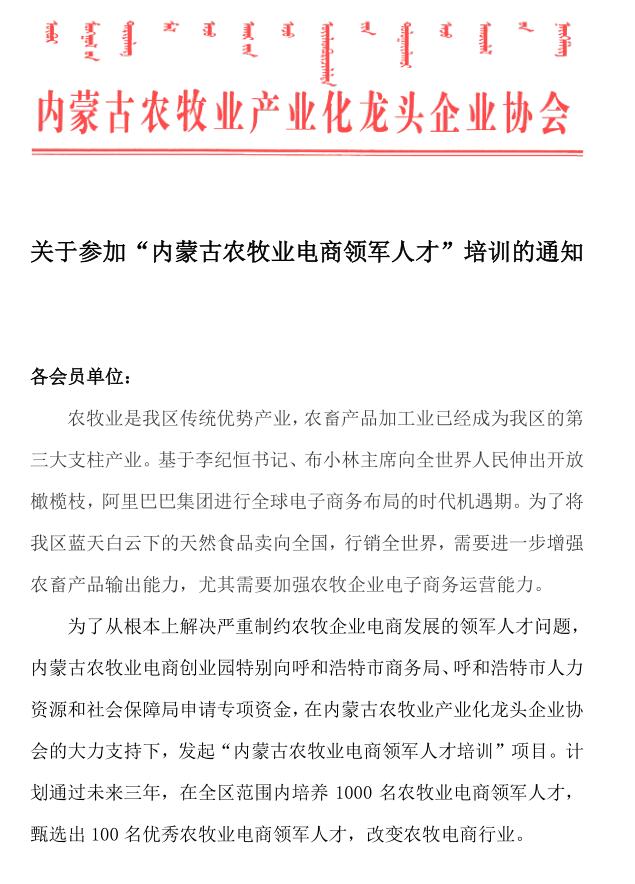关于参加“内蒙古农牧业电商领军人才”培训的通知