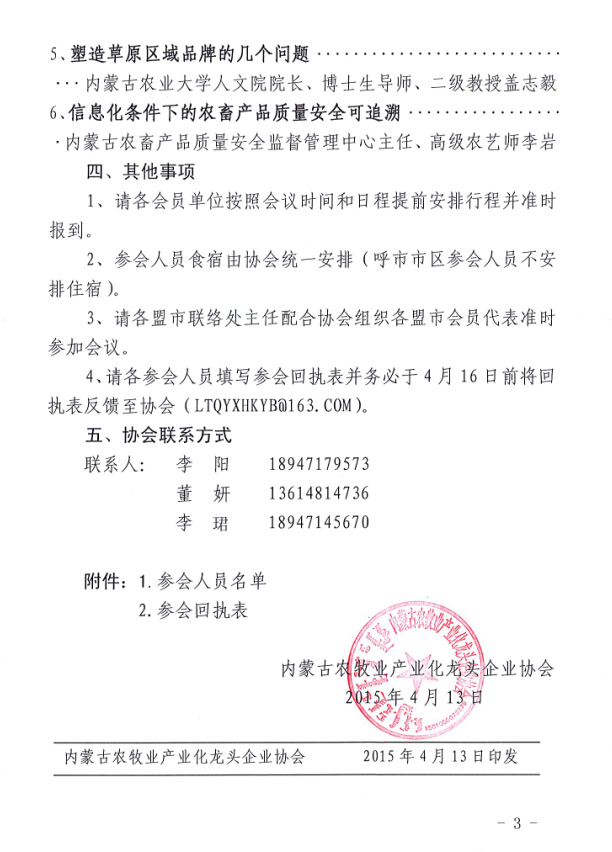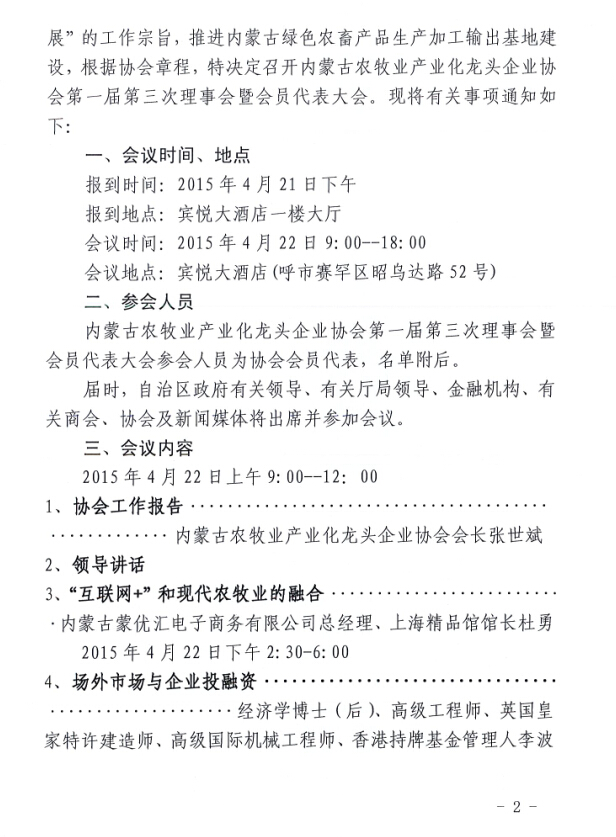 关于召开内蒙古农牧业产业化龙头企业协会第一届第三次理事会暨会员代表大会的通知
