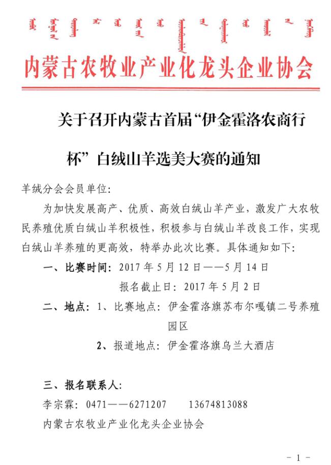 关于召开内蒙古首届“伊金霍洛农商行杯”白绒山羊选美大赛的通知