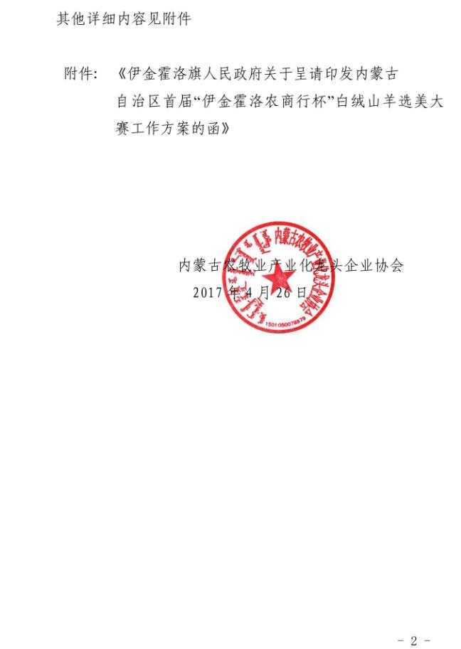 伊政函【2017】64号关于呈请印发内蒙古自治区首届“伊金霍洛农商行杯”白绒山羊选美大赛工作方案的函